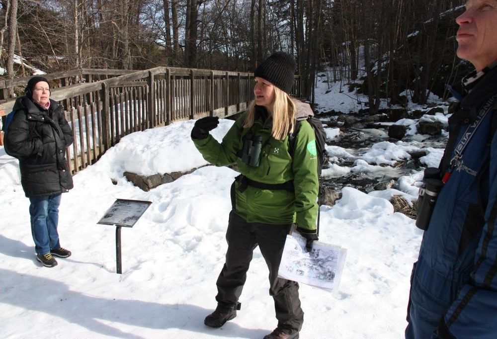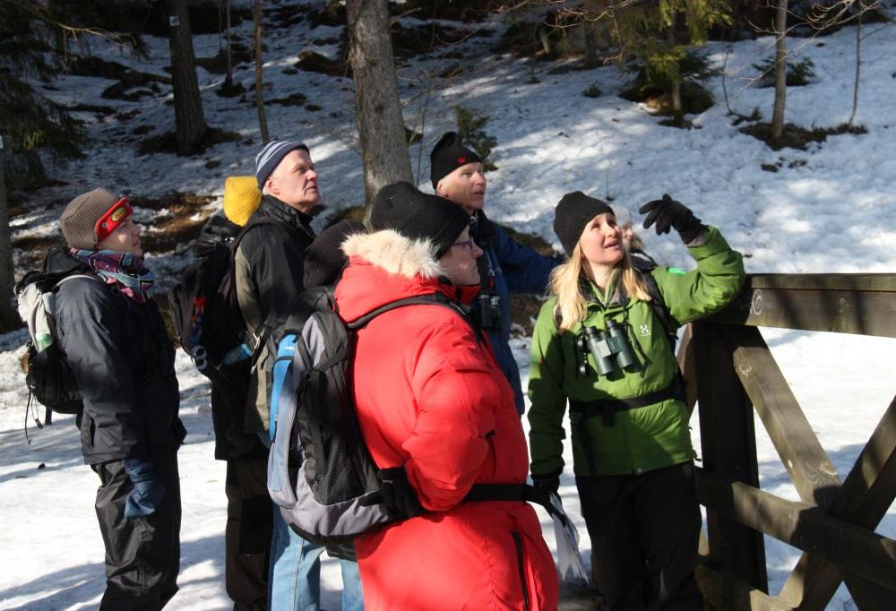Med vår guide Martina inräknad är vi tio förväntansfulla som möts vid busshållplatsen Nyfors en solig, men kylig, tisdagsförmiddag i mitten på mars. Bussen från Tyresö centrum går ofta och är här på sju minuter. Vi bär alla ryggsäckar med varm dryck, några smörgåsar och något att sitta på då det blir dags för paus. Tre timmar ska vi tillbringa tillsammans. Vi borde ha tänkt på att sätta broddar på stövlar och kängor, men bara vår guide Martina har varit så klok.